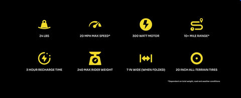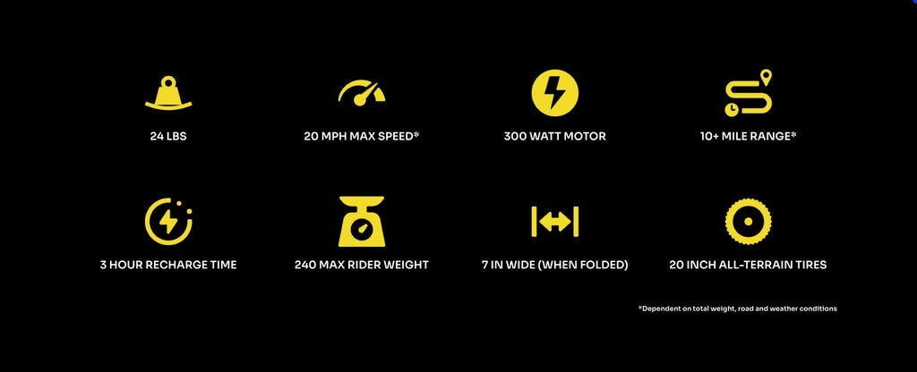 Weighing in at only 24lbs and can fold down to 7 inches wide, which means we can fit basically anywhere. You can easily lift us into your car trunk or up and down stairs, and store us in your garage, closet, dorm room - wherever inside really. Or, bring us on a train or subway and cruise to work from there.